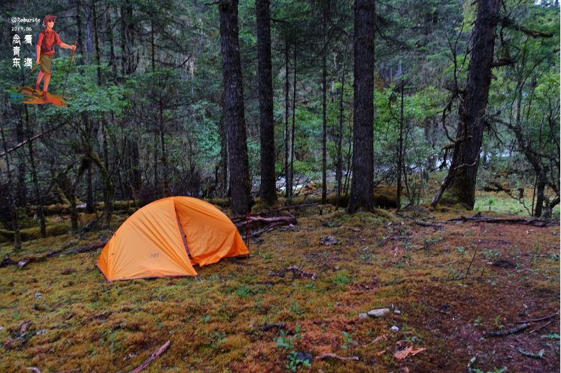 到达水泥路尽头后,又走了10来分钟,抵达一片比较平坦且相对开阔的林间空地,作为今日营地。此地海拔约3720米。