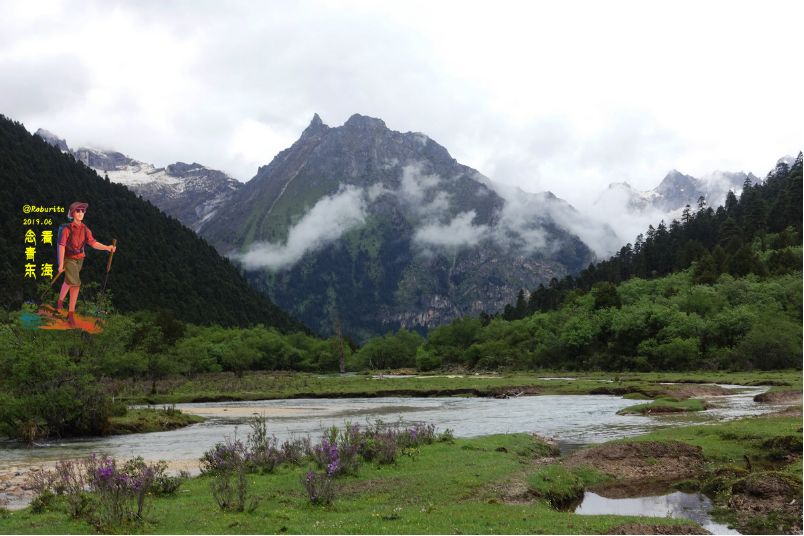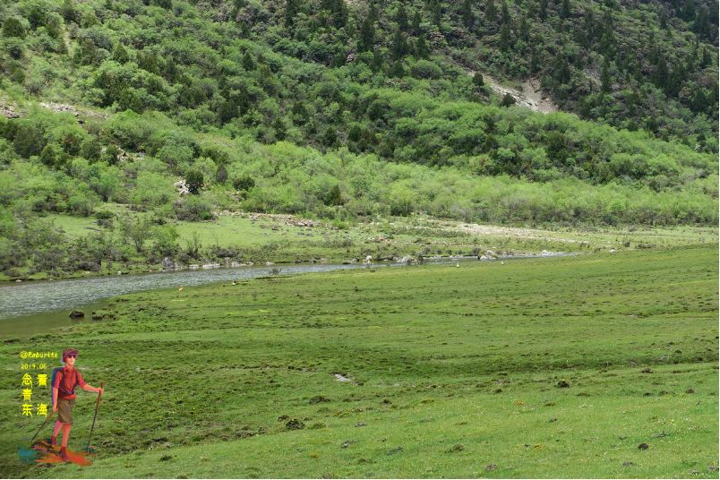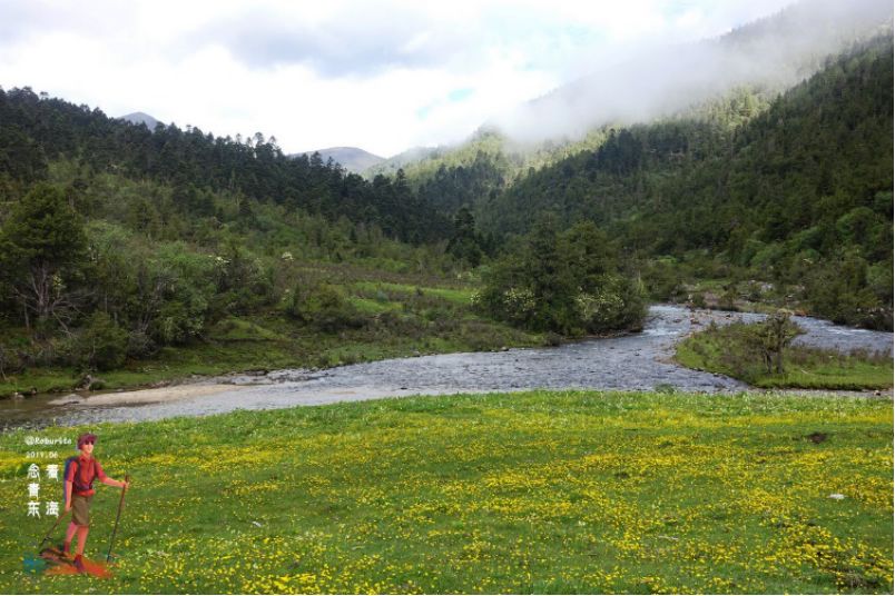 9:09出发,沿着河右侧的机耕路前行。道路两侧主要是树林,低矮处有不少蓝色的绿绒蒿。偶尔有草地出现,开满了黄色的小花。