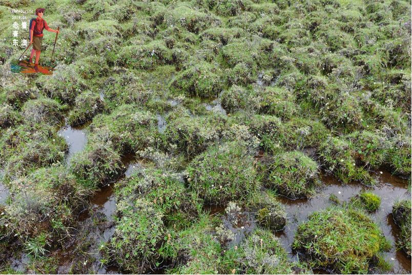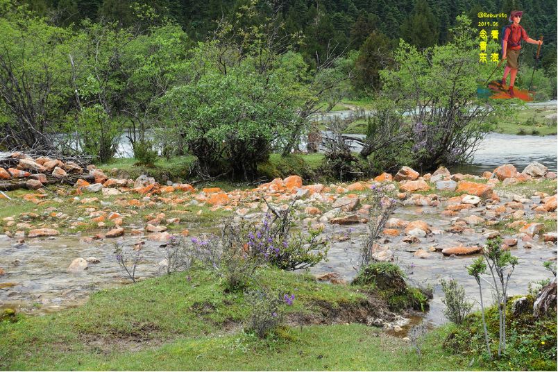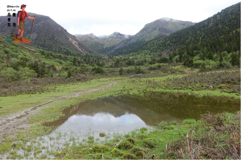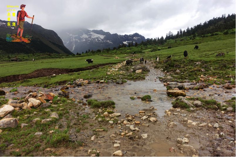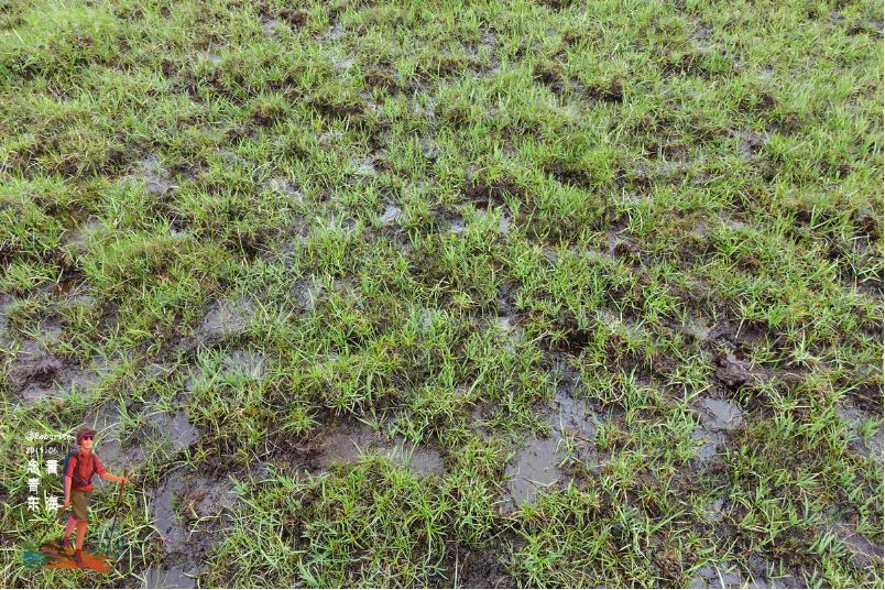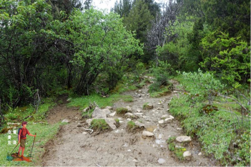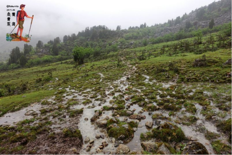 因为下雨及溪水流过,草地上有些路段积水较深,很难找到干爽的地面绕过去。