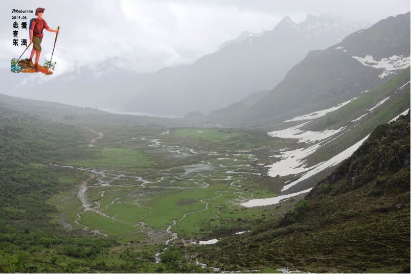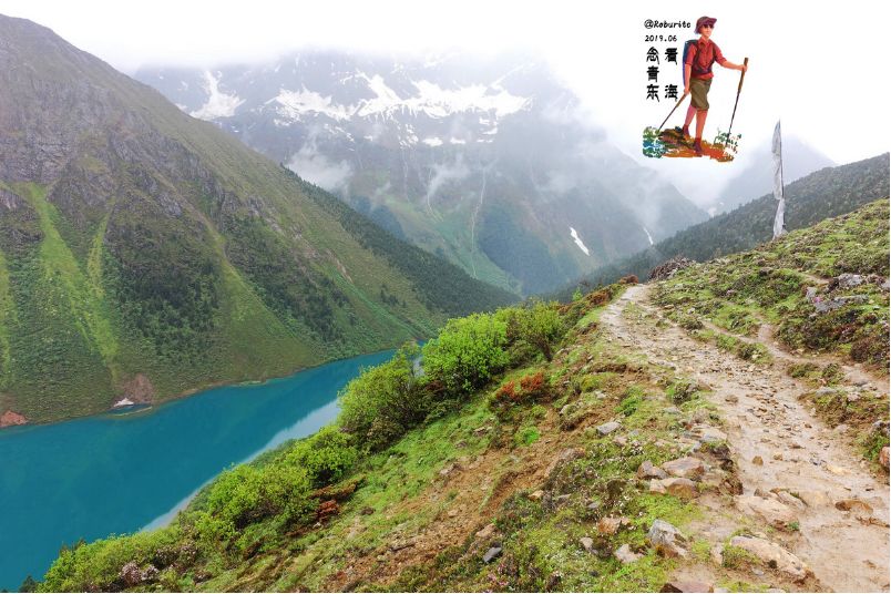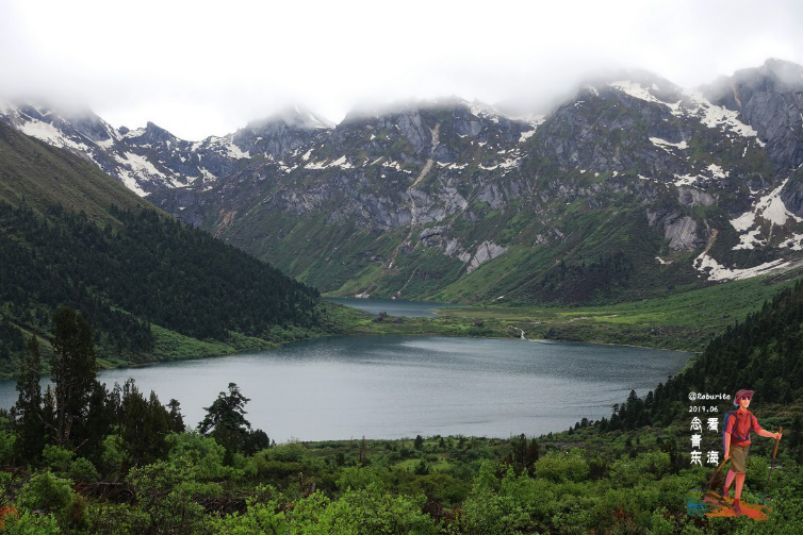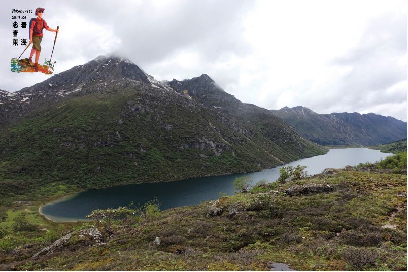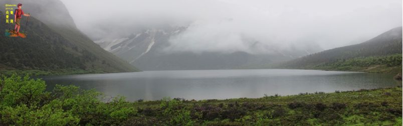 冲击垭口途中,站在山腰处,回看来时的路。达日措掩映于雨雾中。
