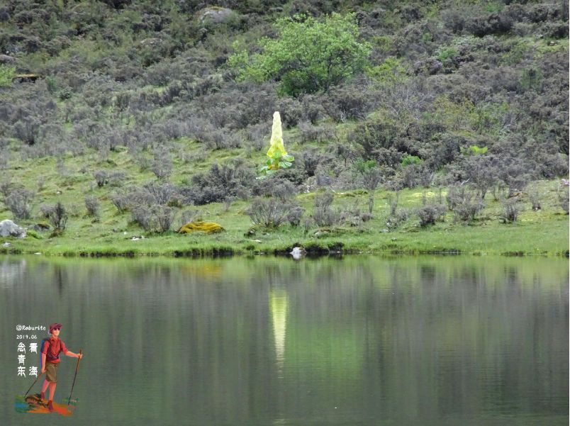 继续往前,前方及左右两侧的山体围了大半圈,仿佛要困住这里的生物,山坡上布满了塔黄,好似驻守关口的兵丁。这是整个行程中看到塔黄最多的时候,一眼望去得有上百株。