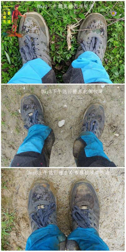 恰好这几天拍过几张鞋子的照片,发张对比照给大家感受一下。可以发现,自第4天开始频繁下雨后,我的鞋子和裤子就开始明显变脏,到第6天已经脏得不忍直视。