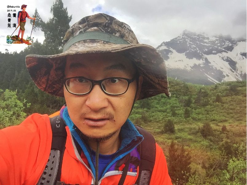 看到雪山和露出的一点蓝天后,心情不错,自拍一张。