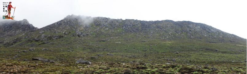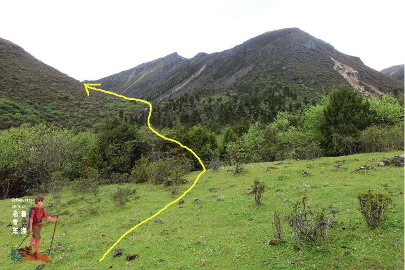 经过一个小木屋后,很快要往左拐,从下图左上方凹陷处的山沟往上爬。