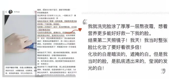 这款熬夜霜被称为娇兰熬夜霜的平替,即使被称为平替但成分和容量都相当出彩!容量有30ml是娇兰的1倍~ 开口是尖嘴设计,能很好的控制用量,很好控制用量,5毛硬币大小就够涂全脸~ 这是一支针对夜间修复的急救水凝霜,涂上去很好推开,像一层水膜吸附在皮肤上,清爽不粘腻~