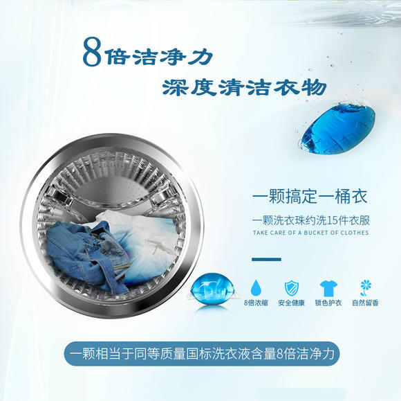 味道清新自然好闻,一颗就能洗一桶衣服(约十五件)洁净力强!一颗更顶普通洗衣液八倍的洁净力!