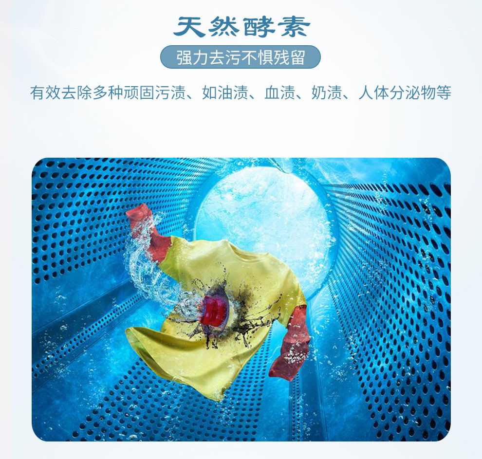细腻绵密的泡沫配合天然的酵素,层层瓦解污渍使衣物柔软舒适,颜色更加的鲜艳洁净!