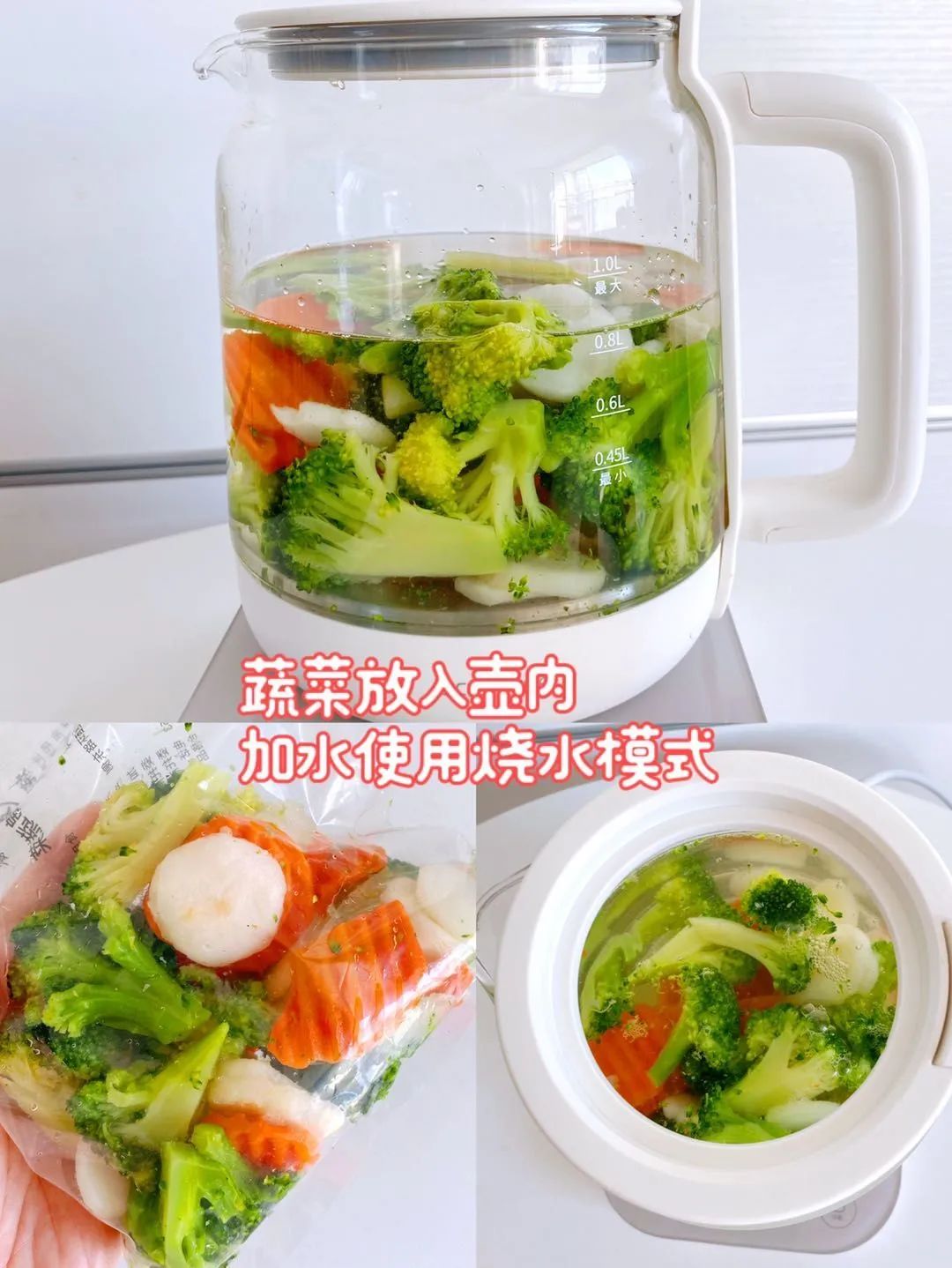 蔬菜包(内含西蓝花,胡萝卜,荸荠)拆开,倒入养生壶内,加水后启动烧水模式,烧开即煮熟,蔬菜软而不烂,非常新鲜。