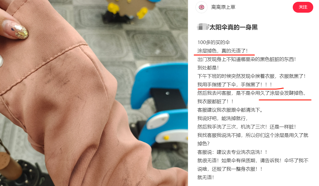 一般的防晒伞都不能在雨天用,尤其是黑色涂层的,会掉色!!