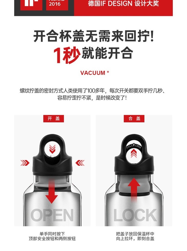 相比与传统螺纹拧盖保温杯,拧的得太紧打不开,拧得太松易泄露,更不用说单手操作