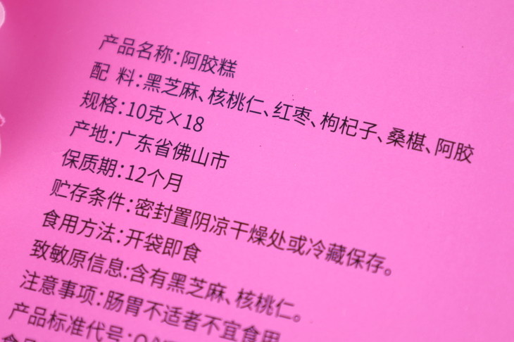 每一块「阿胶糕」的阿胶含量都高达10%以上,再配以黑芝麻、核桃仁、红枣、枸杞子、桑椹,采用无黄酒配方,以枸杞桑椹浓缩液熬膏,不额外添加糖,不额外添加黄酒,药食原料熬制!