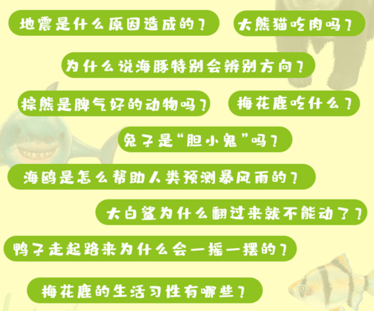 大熊猫吃肉吗?梅花鹿吃什么?为什么说海豚特别会辨别方向?兔子是“胆小鬼”吗?大白鲨为什么翻过来就不能动了?鸭子走起路来为什么会一摇一摆?……这些有意思的问题,都能在书中找到答案。🔻
