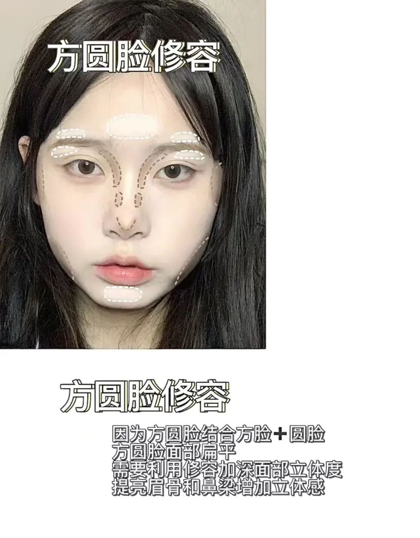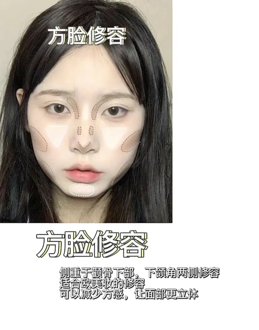 方脸修容注重于把阴影涂在颧骨下方,可以减少面部留白,从侧面看也会增加立体感