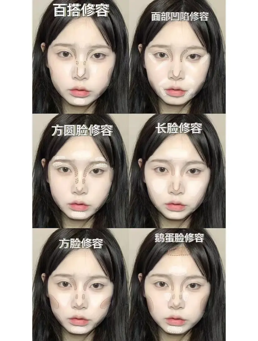 长脸的修容在于减少面部长度,可以提亮面部,使视觉集中在面中区域