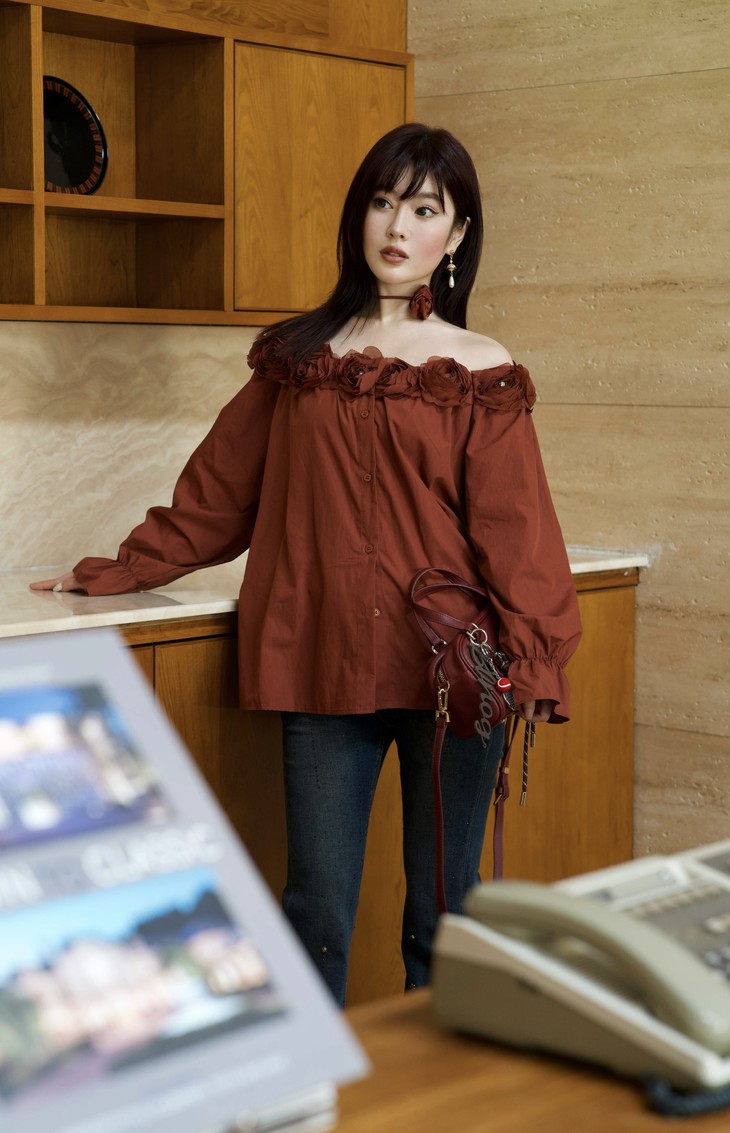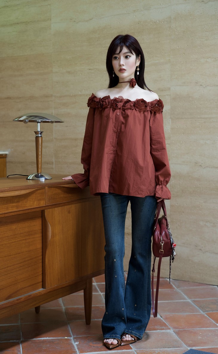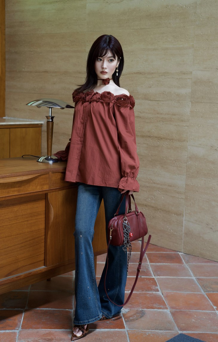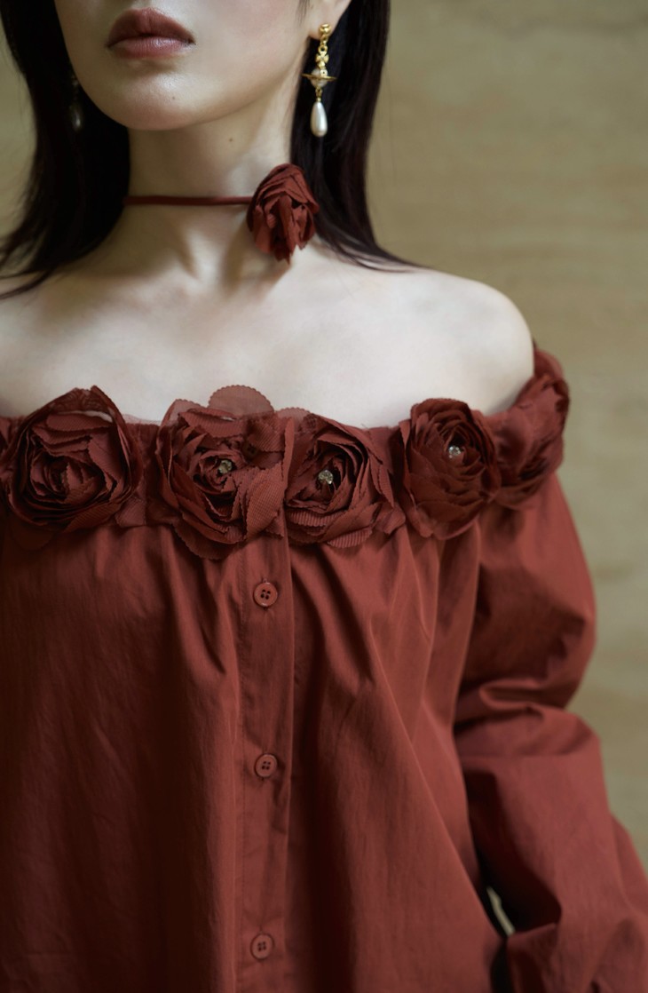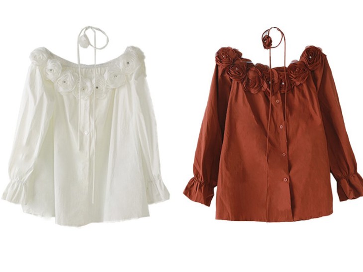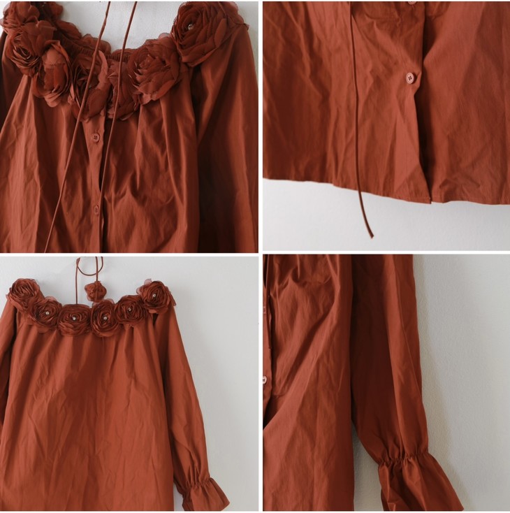 F:衬衣面料,钻饰工艺,立体花卉装饰