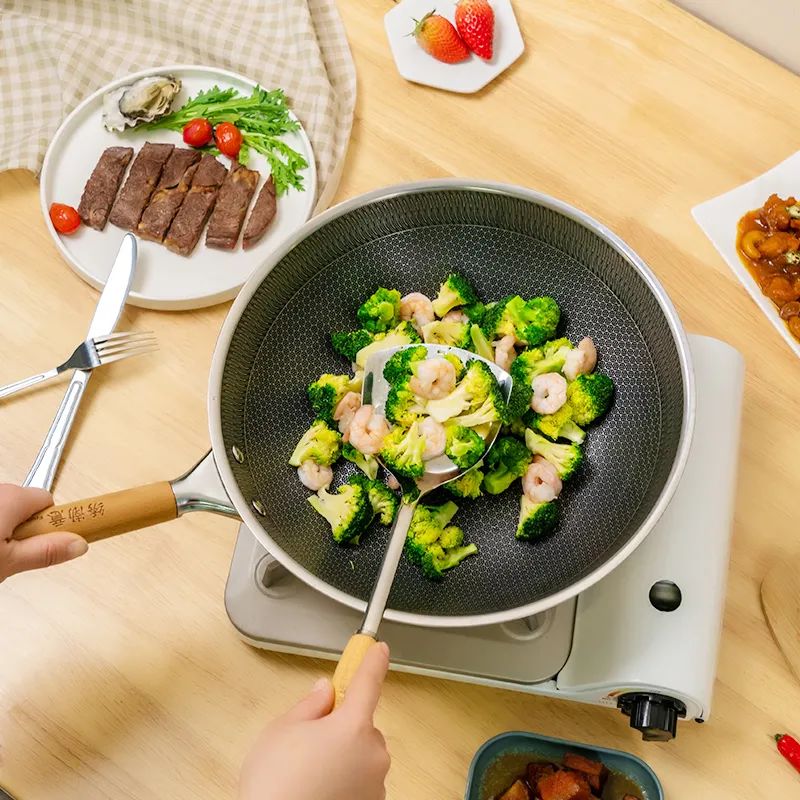 而这款不锈钢炒锅不挑锅铲食材,任你铁铲、木铲,360°翻炒,不伤锅。