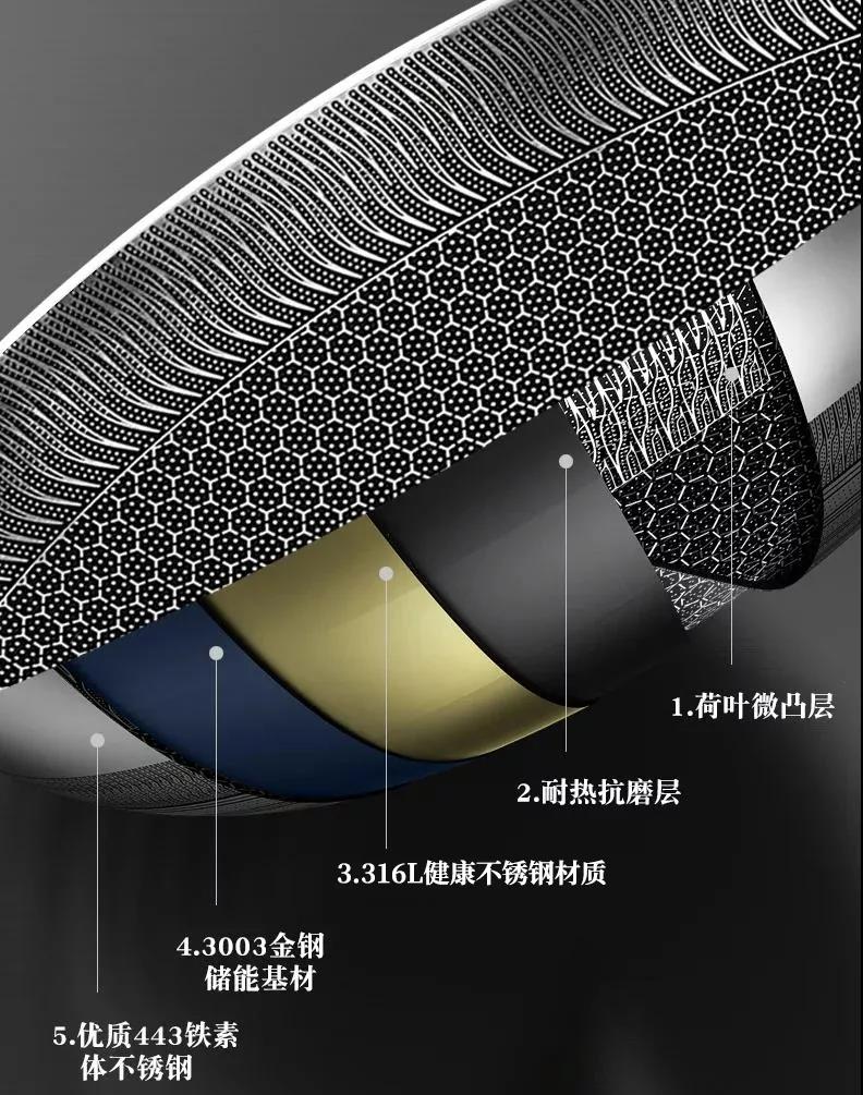 锅表荷叶微凸层和中间层,均采用316L不锈钢,食物接触放心无害。