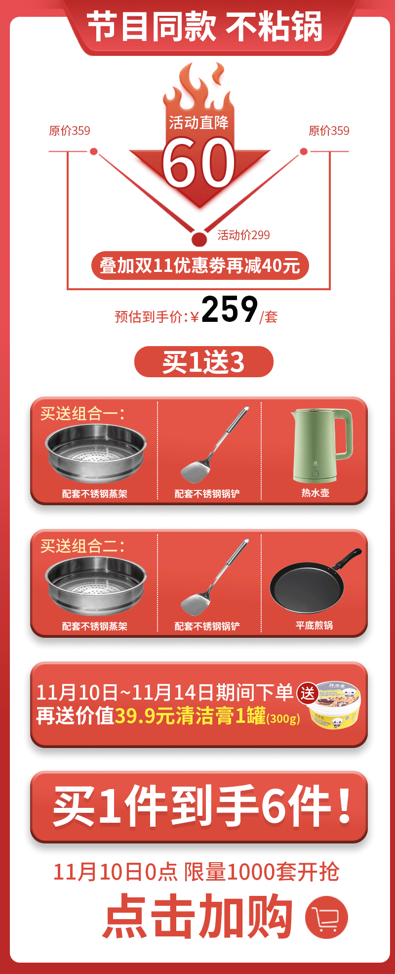 作为一年一次的大活动,这次的不锈钢炒锅的价格、赠品也都很实在。原价359元,活动价只需299元,直降60元,叠加双十一优惠券再减40元,到手价仅需259元!!更是买就送不锈钢蒸架、锅铲、电热水壶(或平底煎锅)以及价值39.9的清洁膏一罐!