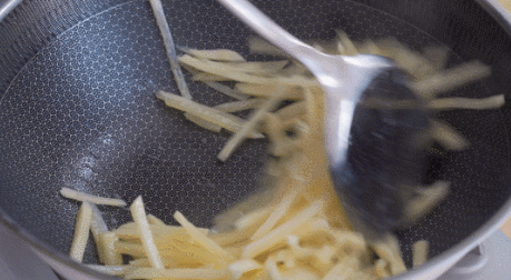 ▲炒淀粉多易粘锅的土豆丝,也根根分明