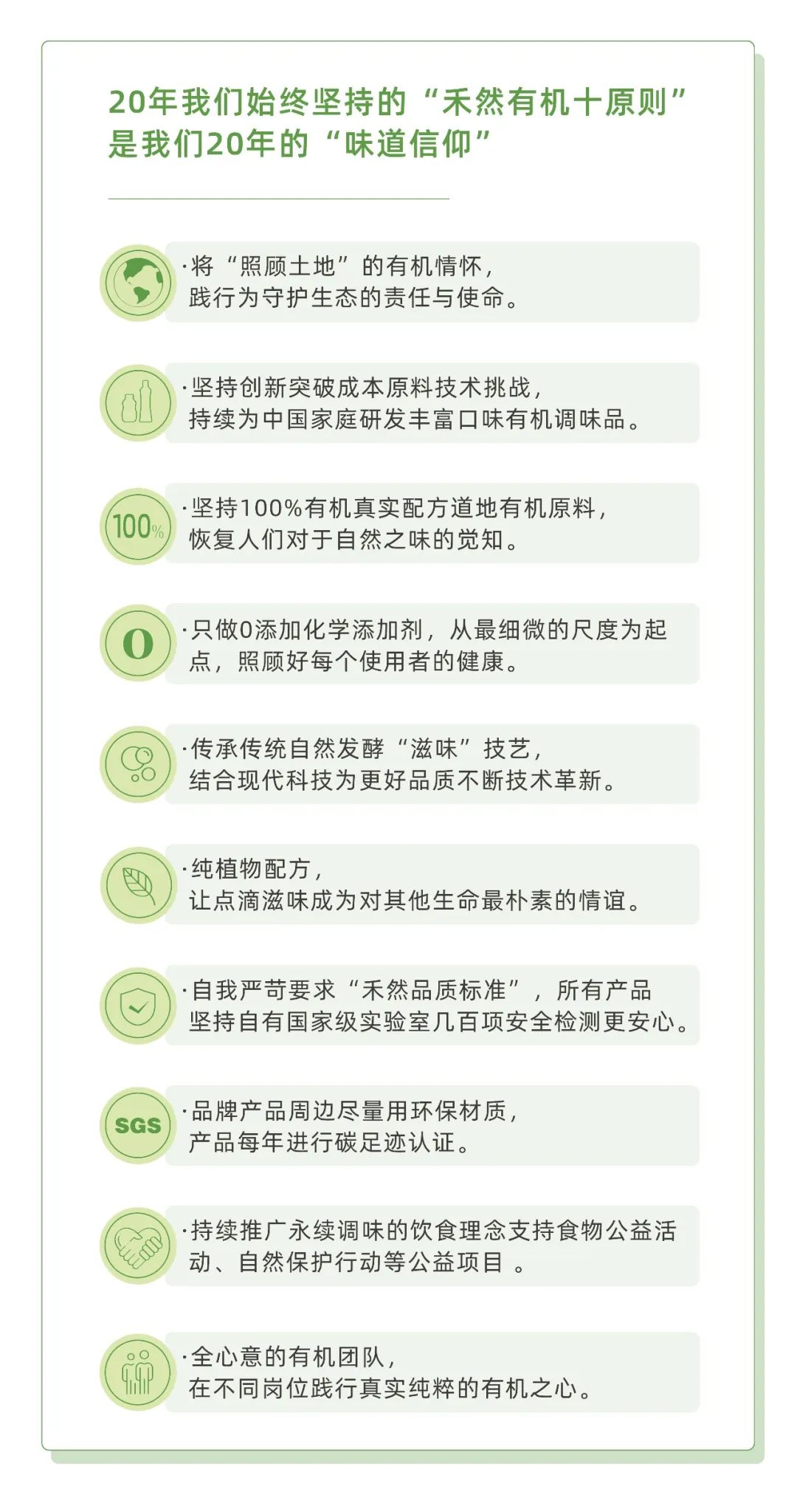 禾然有机20年的历程,正是中国有机调味料的发展史。从改善可持续生态、关注土地与自然开始,禾然有机填补了中国有机调味品的空白。20年来,以10个品类的有机调味品为中国消费者的餐桌提供更安心、健康的选择。全厨房有机调味品,让我们努力诠释照顾的意义,友好自然美一味。20年坚持面对有机挑战,在看不见的地方为你守味,与你“一起发酵”,共同迎接“味来之道”。
