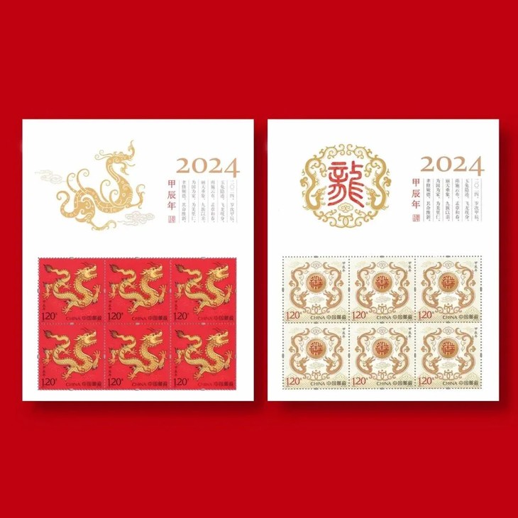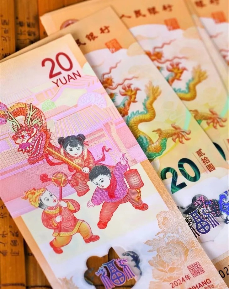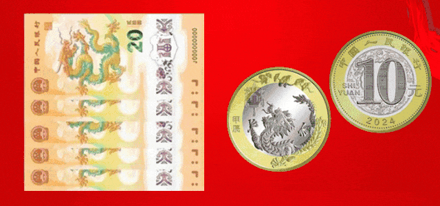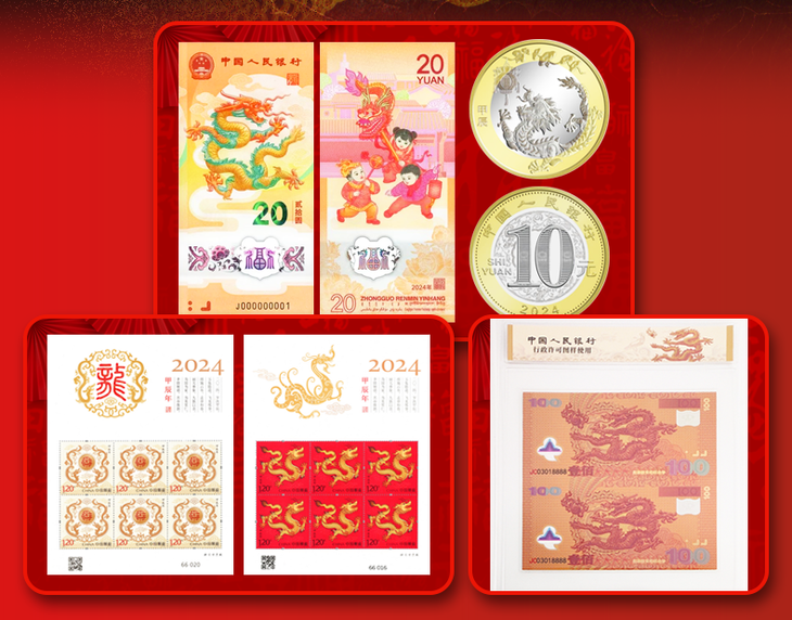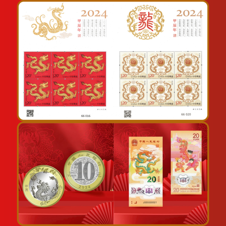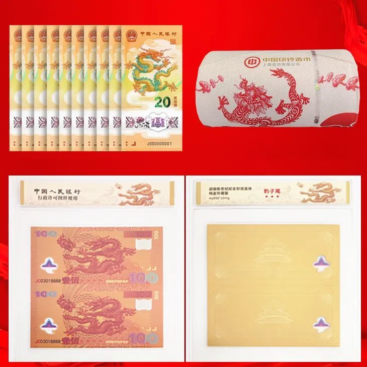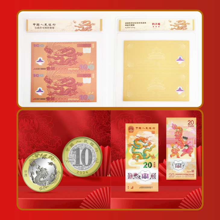 龙年纪念钞(面值20元)、龙年纪念币(面值10元)、2024年两张龙年小版票都有,还特别加入了迎接新世纪双连体龙钞纯金纪念版。