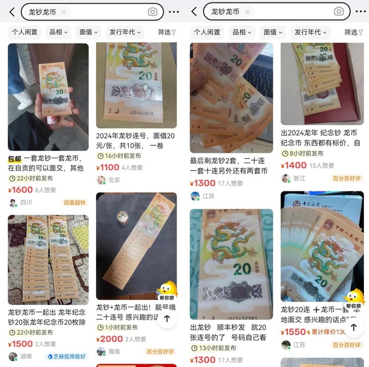 有不少藏友连夜到银行门口开始排队,却没想到余量兑换突然取消。还有些地区因为排队人太多,银行开始控制兑换数量,一人zui多一张!有二手平台价格甚至炒到了千元!一天一个价格,太火爆了!与此同时,网上也纷纷冒出了无数的龙年邮钞套盒“圈钱”,看似东西一大堆,实际很多都是没有授权的不值钱玩意,去某宝搜只要几块钱,若只为了里面的龙钞龙币入手,根本不值。