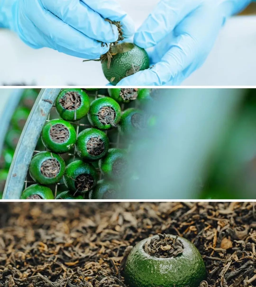 再将经过岁月沉淀的陈年六堡茶满满当当的叶塞入新鲜的新会柑橘果皮内