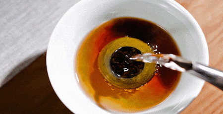 拿起一颗浑圆迷你六堡小青柑放入杯中,沸水之下,杯子里满是明亮的琥珀色,果香引出茶香缓缓飘出
