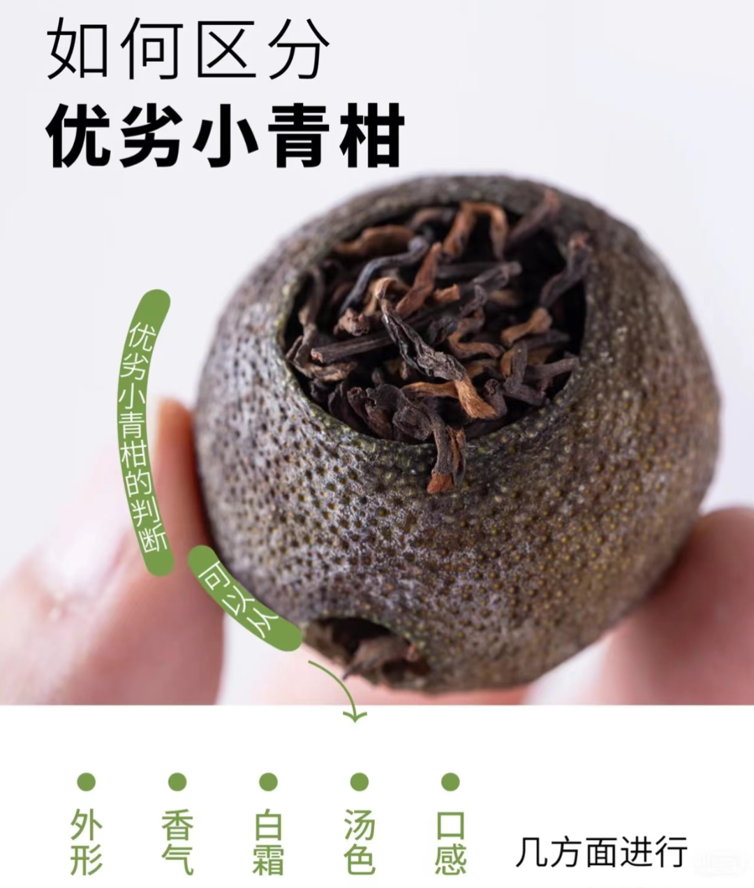我们观察判断小青柑好不好,可以从色、香、味、触四个感官来观察