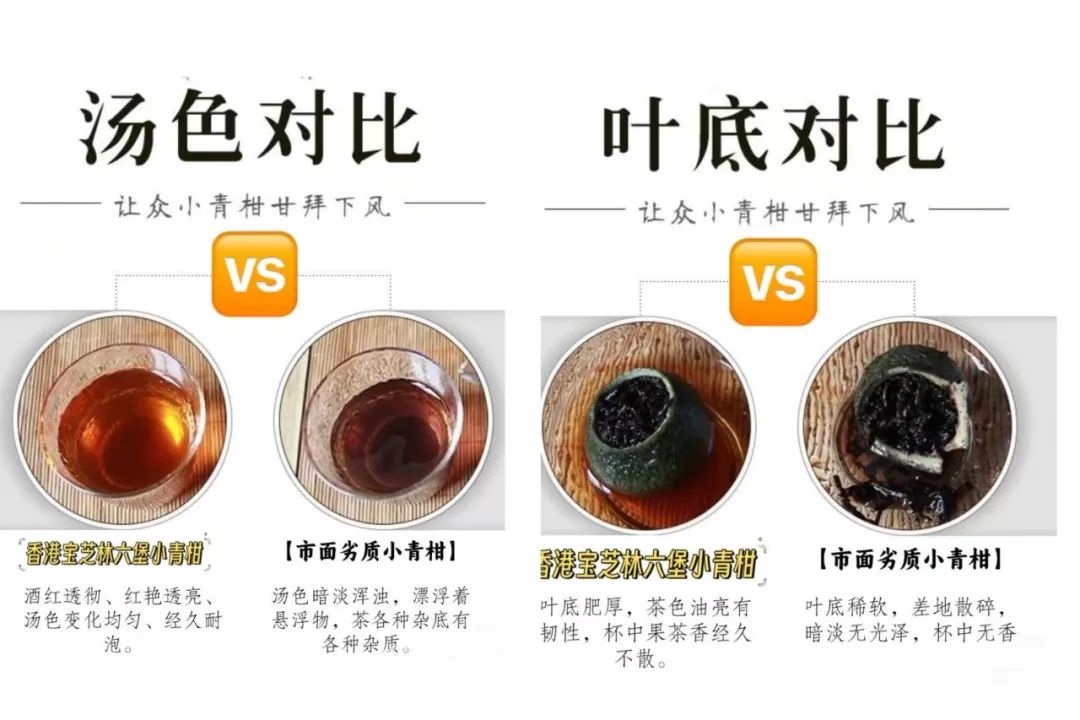 咱们这款六堡小青柑跟劣质小青柑做了鲜明对比,家人们可以仔细感受