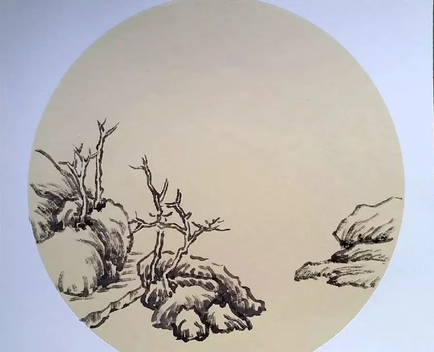 第二步:现在中间的这一组山石树木就先画到这个程度,不要在一个局部刻画太久,应该先把整体的走势布局确定出来,再进行局部细节刻画。顺势画左侧山石,两组石头之间要留一个空隙,这里要画一条山路。左侧树木一样画法。左侧山路画出,石头略加皴擦。需要把右侧的山石定位,看好比例,根据之前的构图分析,找准彼此之间的参照关系。