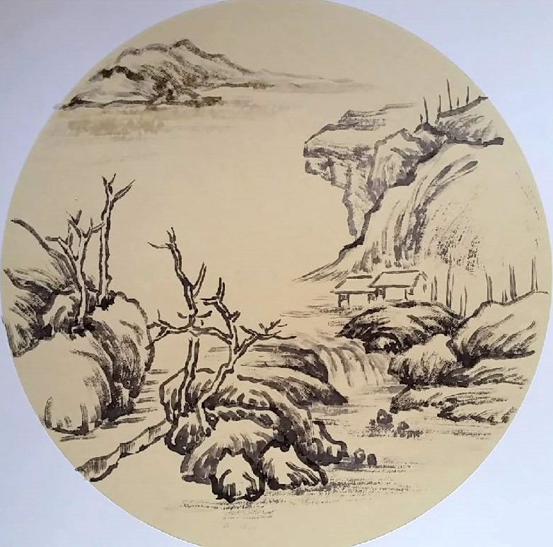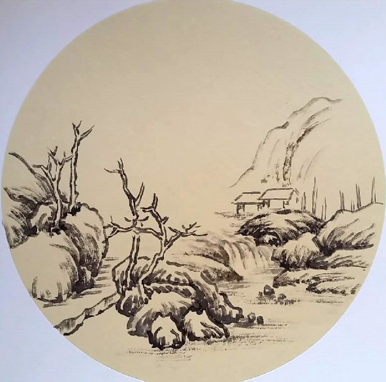 第三步:这一个局部的关系确定,画出瀑布、水流和房屋建筑,把房屋边的地面和杂树丛略加表现,近景的部分就基本确定了,根据比例,留出中远景的位置。根据近浓远淡和近实远虚的规律,中景的山石要使用略淡一些的墨色,尤其是靠近房屋的山石部分,不只是墨色略淡,还要注意用笔虚一些,这样既拉开了层次,又可以使房屋更加醒目。