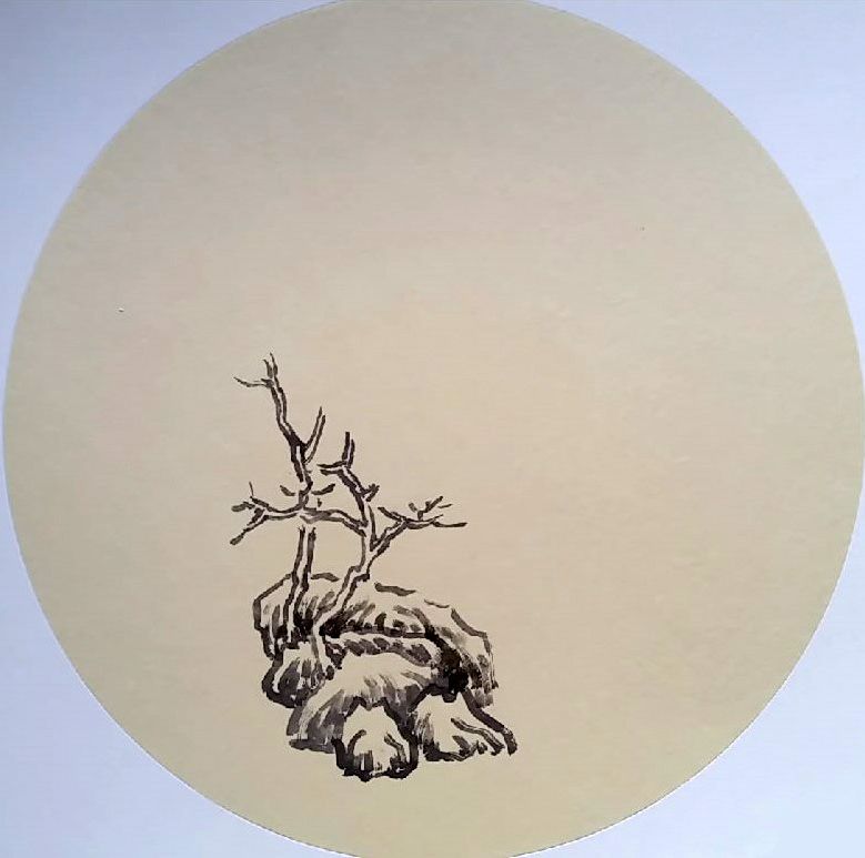 第一步:起稿,先从山脚开始画起,注意用笔的线条质感,实践练习笔墨形质的知识点,找准线条质感,控制水分。画出两棵树木,注意每块石头彼此之间的关系,要先画前面的,再画后面有遮挡的,就利于表现结构的层次感了,这里要画出树木从石头缝隙里生长出来的感觉,因此树根的细节,要耐心刻画。
