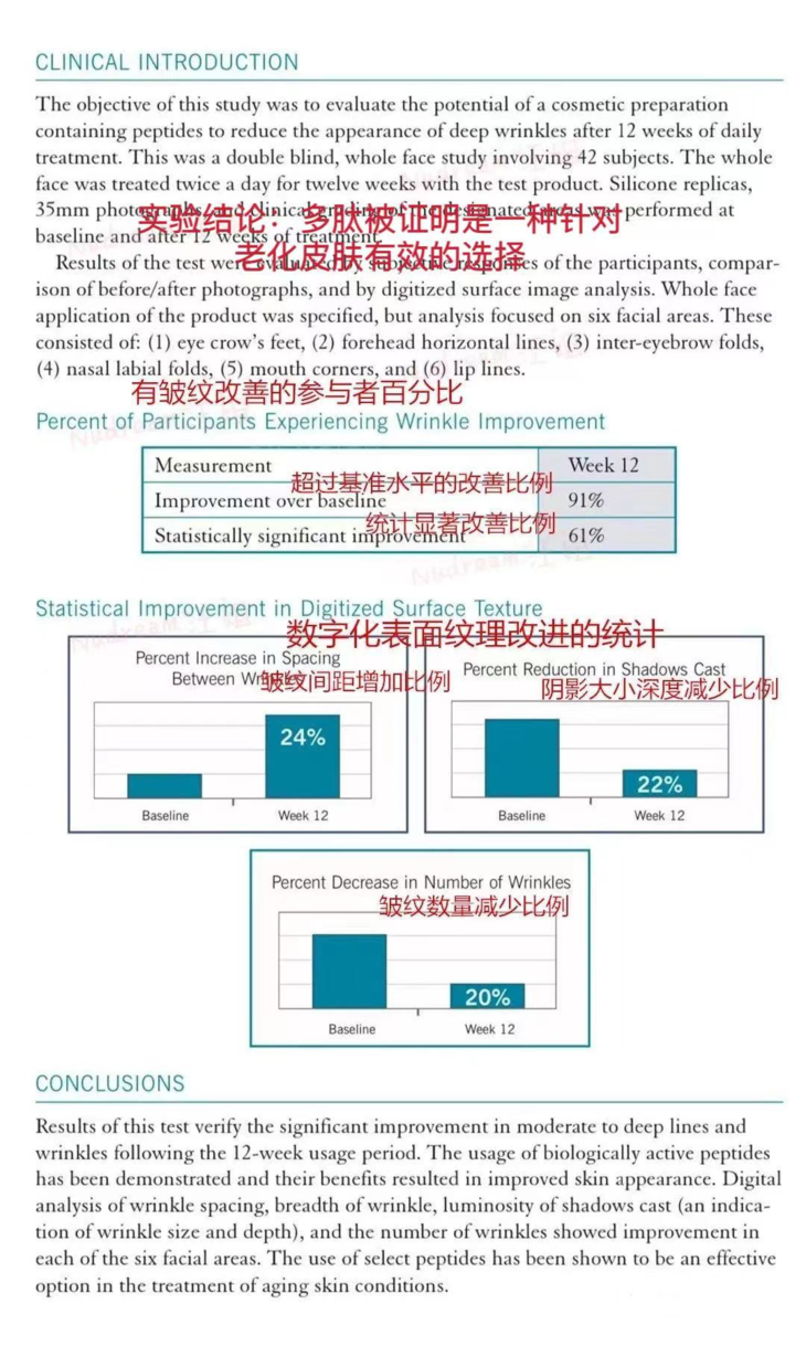 多肽已被证明可以对抗真皮层胶原蛋白的降解,改善中度到深度纹,使皱纹外观发生显著变化。