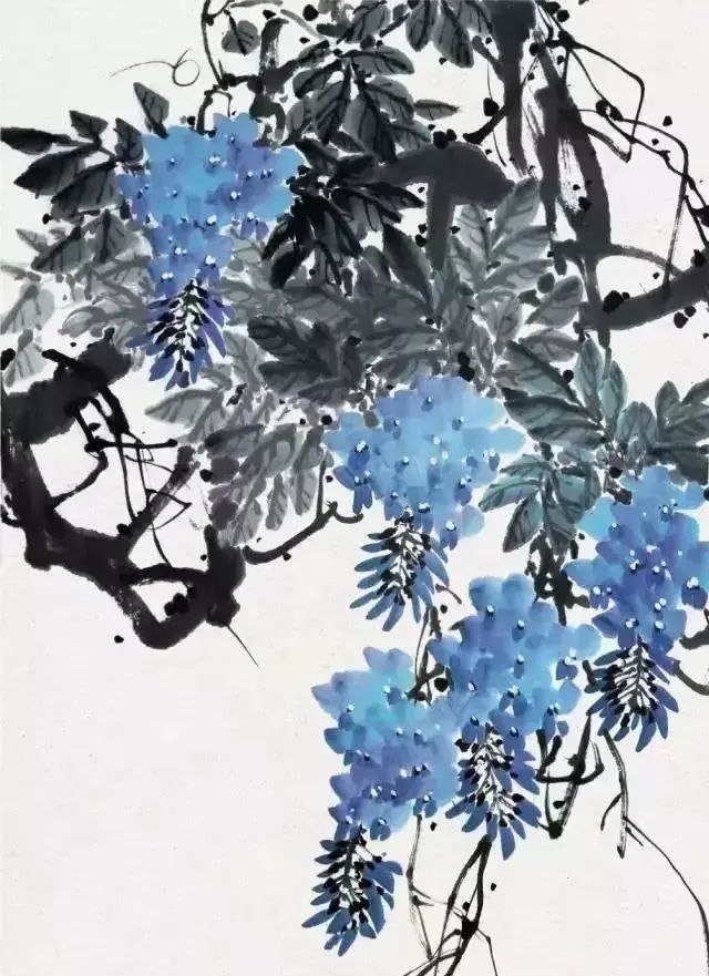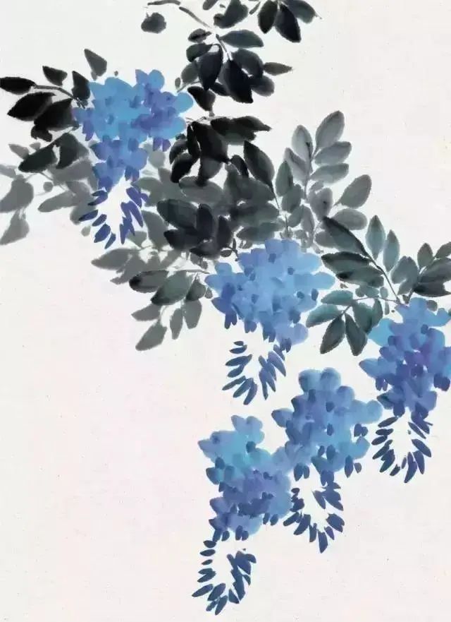 步骤三:白云笔花青调墨画有浓淡变化的花叶。