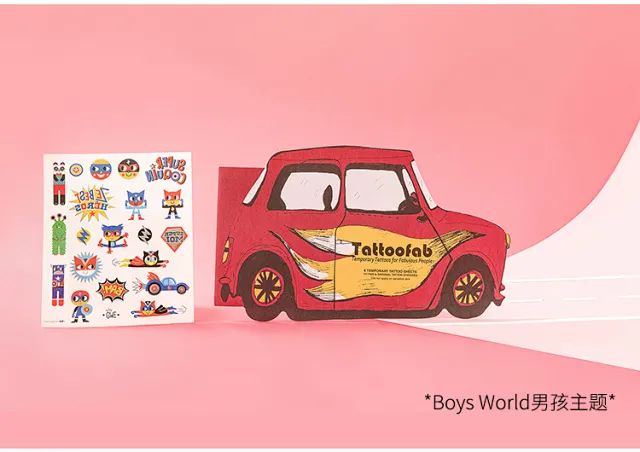 男孩世界,包装是一个很酷的小汽车造型,里面共含8张,太空火箭,西部牛仔,骑士城堡,小怪兽等,都是小男孩最喜欢的图案。