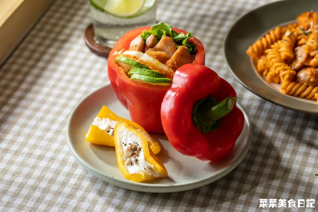 除了剖成片,你也可以给彩椒开颅,把蔬菜、肉放进去,甚至可以抹进土豆泥、紫薯泥来充当主食份额。拎着这个彩椒便当上班,便当盒都能吃,营养还很全面咧。说到底嘛,彩椒汉堡就是靠其他食材和酱汁来给彩椒增味。所以日常自制卷饼、越南春卷、卷凉皮之类的,都可以加点彩椒进去~彩椒颜色丰富,菜品色彩搭配上会更好看,加热过也会变得更甜。炖肉、炒菜、炒肉、炒面、烤鱼之类啦,彩椒都能用得上。往上面撒一点盐、黑胡椒,简单成菜,当然也可以配酱入口。