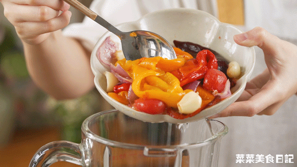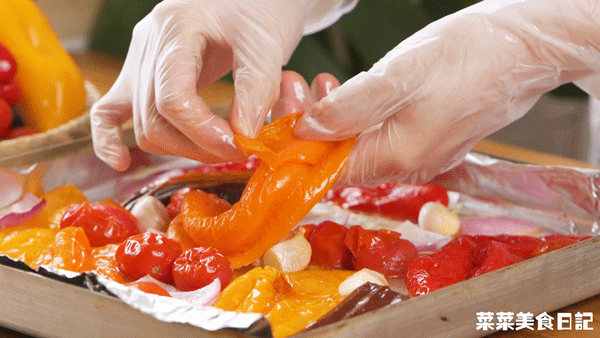 Romesco用烤过的红椒和番茄,配合大蒜、坚果、橄榄油、盐、黑胡椒等一起研磨打碎。当地人会拿它搭配海鲜、鱼类或是蔬菜,很地中海饮食。我就不局限于红椒了,红色、黄色、橙色、巧克力色的彩椒都拿来烤。