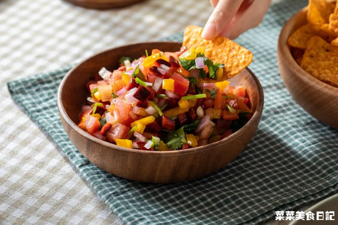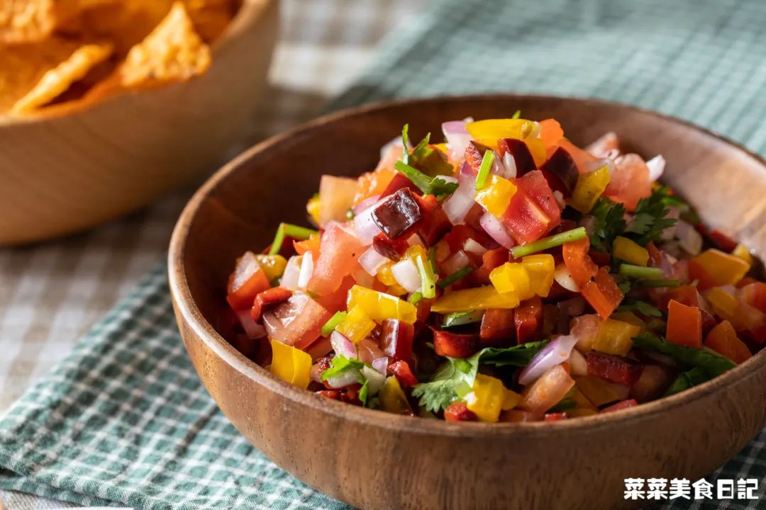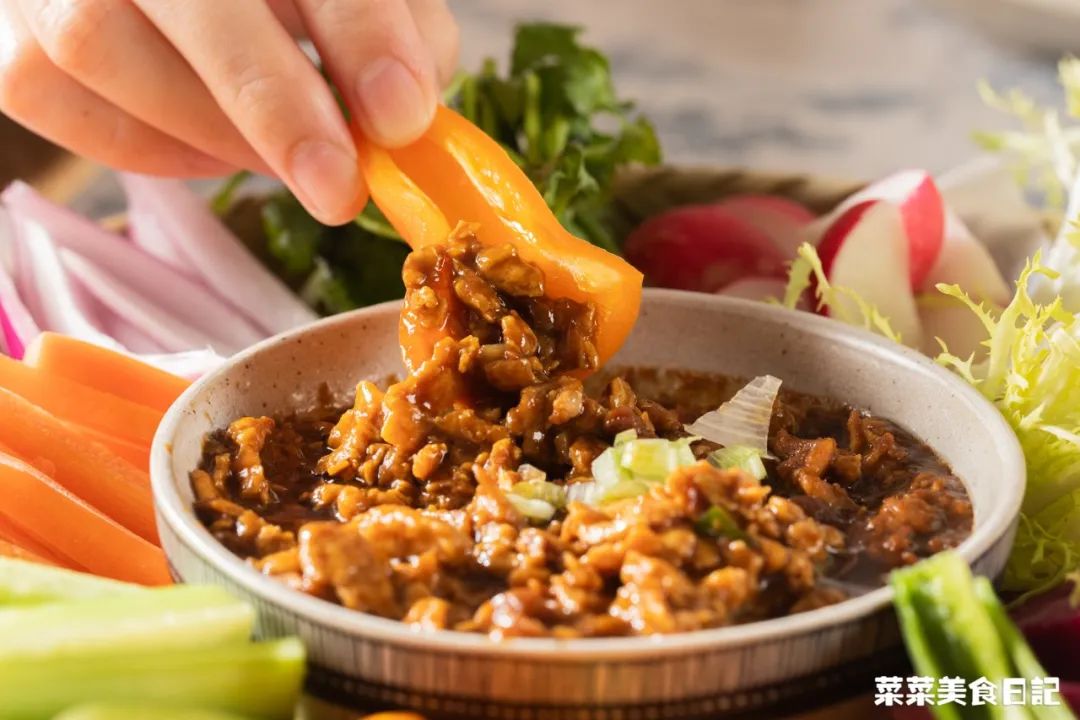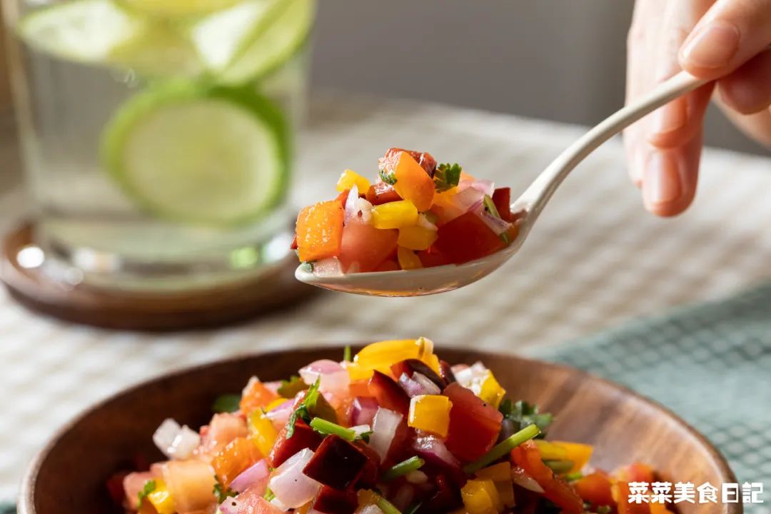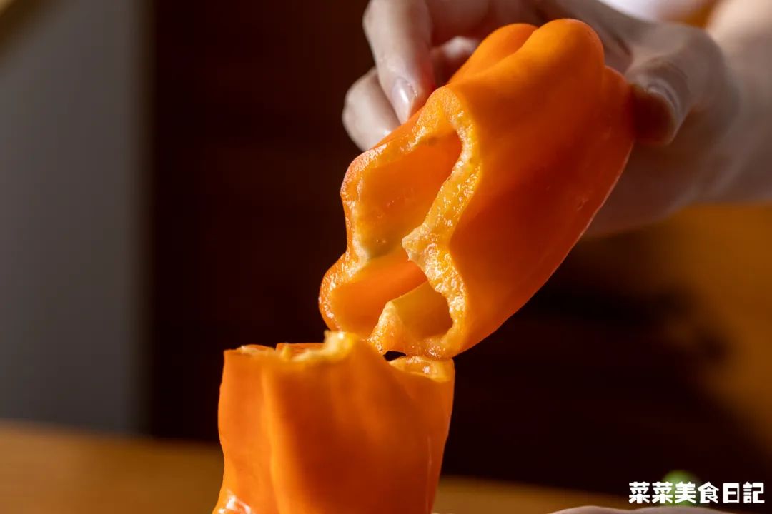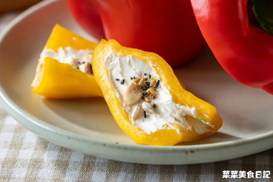 所以,想多吃VC对皮肤好,那就生吃彩椒;想多吃VA对眼睛好,就做熟了吃。彩椒口感爽脆、汁水丰盈,还带点清甜,也完全不辣,我生啃一整个无压力。担心吃不够VC的打工人,不妨每天带一个彩椒去公司洗了吃。喏,我最近刚消耗完一箱,甜度高达9.5,比普通的灯笼椒好入口很多。彩椒结构中空,刚好用来填东西,最近小红书就很流行用它和奶酪搭一起。彩椒的清香放大了奶酪的奶香,奶酪则压住了彩椒的青味。口感也很讨喜,丝滑裹挟着爽脆,奶香在嘴里柔柔化开,吃完齿颊留香。我还试过用酒酿来搭,味道能接受,就是挺奇怪的,就不推荐给大家了 做起来不要太简单,起锅热油,2个鸡蛋液滑散,加入3大勺东北大酱炒香。直接用彩椒舀着入口,清香汁水刚好中和了酱的油润,满口清爽、咸香。你也可以把彩椒切成条,用生菜包着酱一起入口,很适合当减脂餐吃。所以大家平时拌小凉菜,都可以切点彩椒进去充当蔬菜份额,不知不觉摄入了营养~说是酱,其实更像沙拉,用番茄、洋葱、辣椒、香菜切丁后调味而成。既然用到了辣椒,换成彩椒也妥妥的,平时用来搭配玉米片、薯片,爽脆解腻。这个做法把彩椒切成了丁,营养肯定会损失一部分,但胜在热量低。可以当成卷饼、吐司、欧包、贝果的topping,有食欲还不怕胖~1/2个彩椒丁、1/4个洋葱丁、1个番茄丁、少许香菜末、蒜末,加1大勺柠檬汁、1/2小勺盐、少许黑胡椒碎,拌匀腌制半小时。附一个更方便去除彩椒芯的方法:头朝下,沿芯切开,接着切块/切丝/切丁即可。煎个虾饼,夹上生菜、番茄、洋葱、芝士,再挤上喜欢的酱汁,搞定。