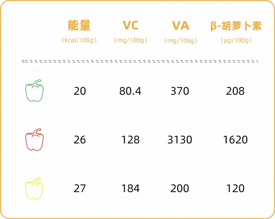 简单来说,红色、黄色、橙色的彩椒,营养比绿色彩椒更优秀。VC是水溶性的,水洗、切碎、烹饪等处理方法都会造成一定损失。而VA是脂溶性的,加点油烹饪之后吃,利于VA的吸收。