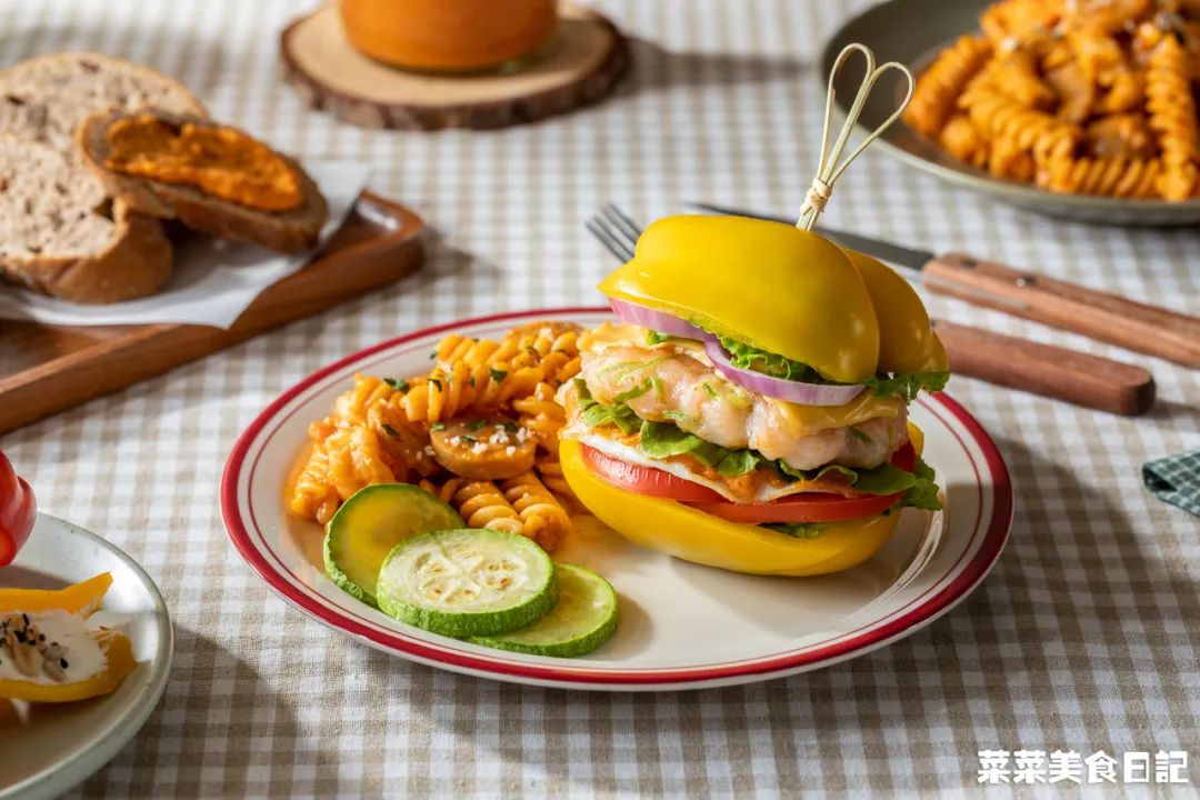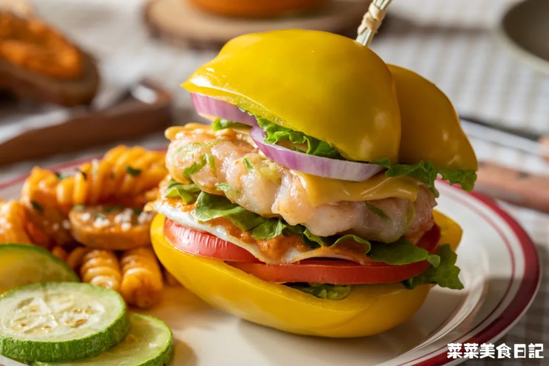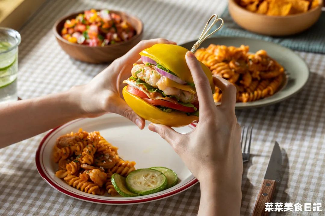 我后面会教一个彩椒酱做法,也挺适合放在这个汉堡里。