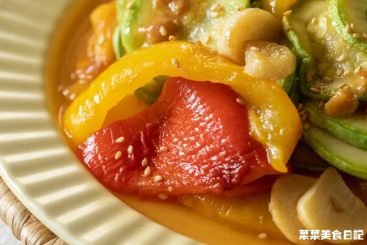 空气炸锅/烤箱180-200度烤20分钟,外皮烤焦了也没事,撕掉就好了。一个小经验,烤好的彩椒盖保鲜膜焖10分钟,外皮更好撕,还不会烫手。没有烤箱或空气炸锅,也可以往彩椒身上叉个叉子,架明火上烤。烤过的彩椒拿来炒,很容易入味、出汁,和西葫芦也很搭。一个软嫩香甜,一个爽脆可口,不加一块肉,照样人人抢。西葫芦同样是清甜低卡的宝贝,这菜减脂期姐妹也可以放心吃哈。接着加入1小勺生抽、1小勺黄豆酱、1大勺陈醋调味,出锅前可撒点白芝麻装饰提味。