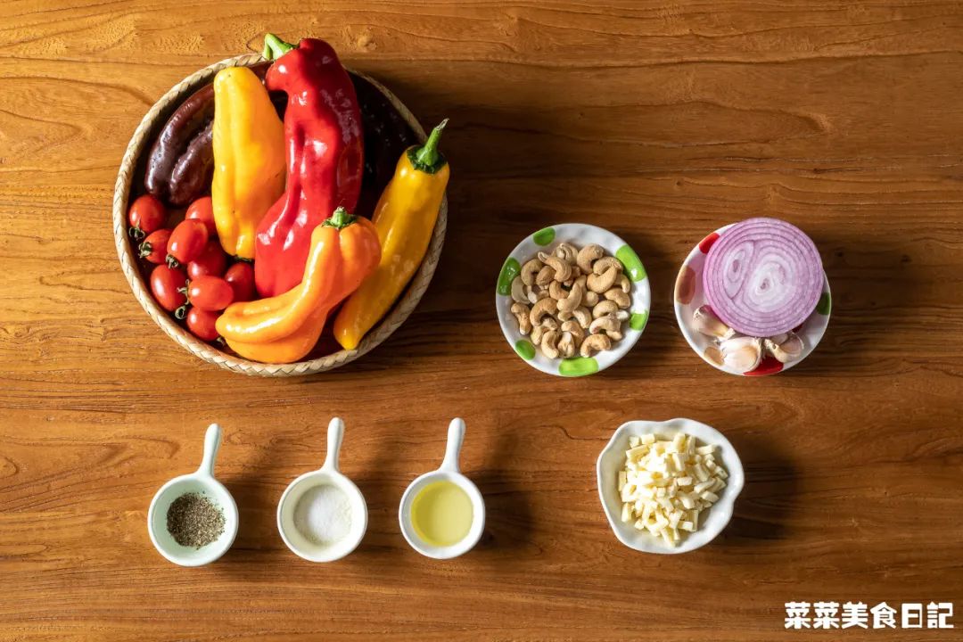 除了这些基础食材,还可以根据个人喜好来增加调味和食材。喜欢奶香味的可以加干酪进去,不过加了奶酪就得尽快吃完哈。为了增加酱的稠度,西班牙人还会加面包糠进去搅打呢。水果彩椒400g 小番茄100g 洋葱半个 蒜瓣4瓣 无盐熟腰果30g橄榄油1大勺 黑胡椒1/2小勺 盐1小勺 帕玛森干酪30-50g(可选)2、烤盘铺上彩椒(皮朝上)、小番茄、蒜瓣、洋葱块,淋入少许橄榄油,220度烤15-20分钟,剥去表皮备用做好的彩椒酱密封冷藏保存5天,加了奶酪的话最好2-3天消耗完这个配比做出来的浓稠度我挺喜欢的,当面包抹酱很容易抹开。湿润、清爽,彩椒香气占了大头,总体是很柔和的酸甜口,接受度应该蛮高的。没有完全搅到细碎,保留了一点坚果颗粒度,咬到会很惊喜。除了抹面包、配海鲜,还可以当各种炸物的蘸酱,解腻效果不输刚才教的莎莎酱~最近我司工资回收计划,又多了一个项目,就是这款卡樂佩普彩椒。卡樂佩普是新型品种,精选欧洲优良品种杂交培育而成。