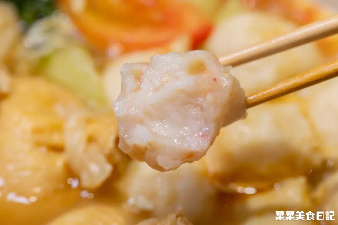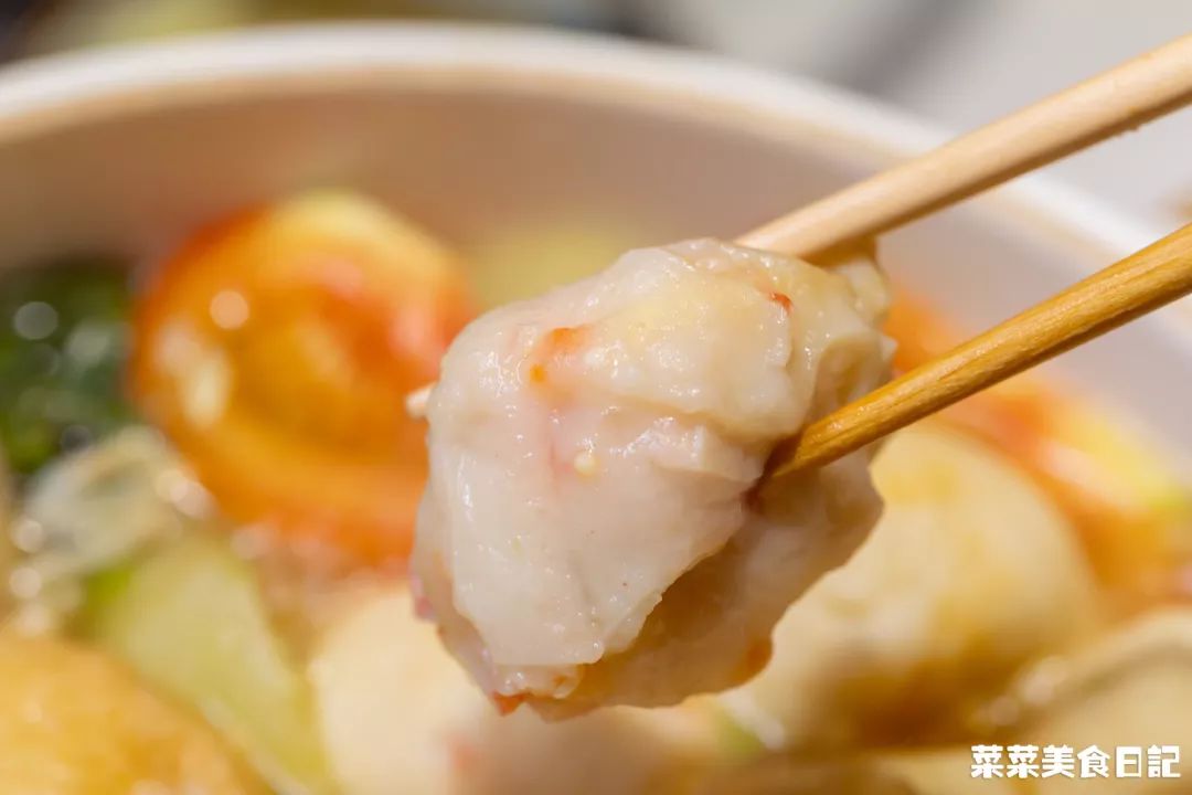 所以它的口感也最复合。肉质非常紧实,满满的细小虾肉看得到,用料很实在,每颗丸子都超饱满!