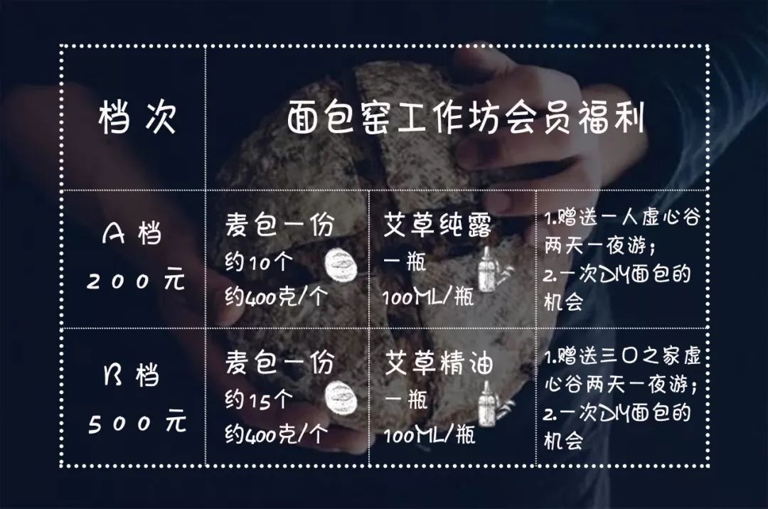 4.赠送一人虚心谷两天一夜游,及一次免费DIY麦包的机会「期限两年,包含食宿,虚心谷举办活动期间不可使用,可转让」;
