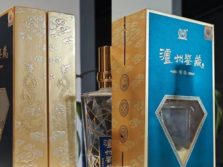 酒盒的设计非常精美且具有质感,整体藏青色调,中央镂空的钻石形状,上面印有金色的“泸洲鉴藏”字样。