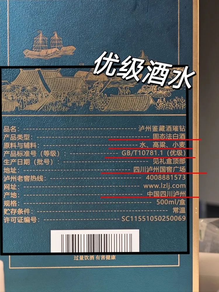 【泸州鉴藏璀钻】的执行标准一栏标注GB/T10781.1(优级),而且原料只有水、高粱、小麦。