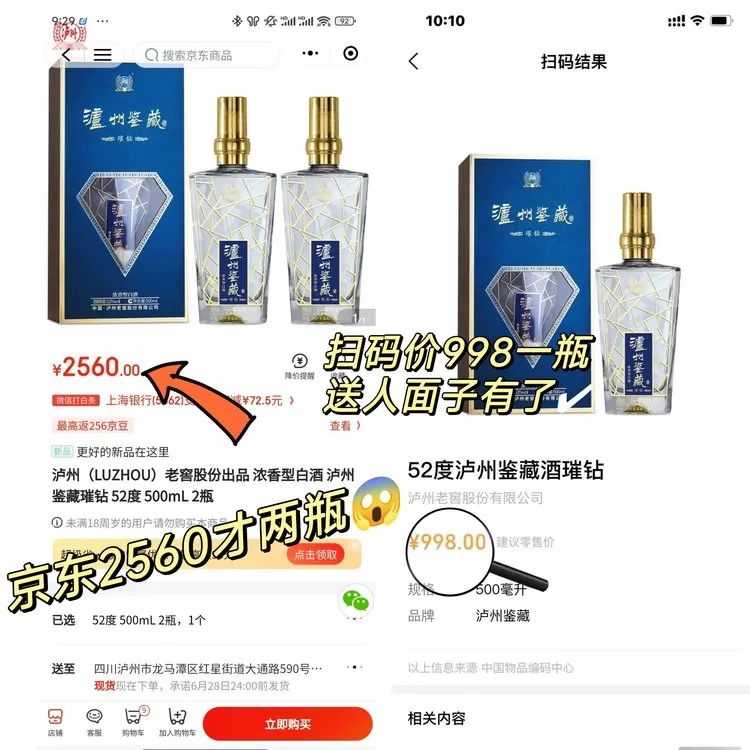 要知道在某东2瓶可是高达2560元,扫码价也是998元/瓶的。