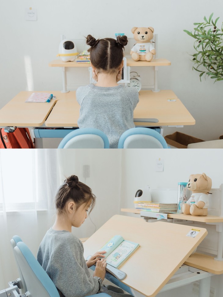 自从入了新桌椅,睿睿写作业也不用我催了,作业效率提高了不少,看书也不会随意窝沙发,会乖乖坐在书桌前看了,还会带着妹妹一起画画,看识字小动画。