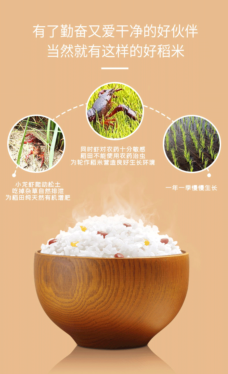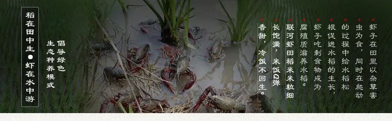 在“稻虾共生”种养生态系统中,稻田为小龙虾提供活动空间,小龙虾生长健壮,稻谷收获后秸秆还田、冬季灌水、培肥水质,既肥水养虾,又杀灭残存害虫,减少次年虫害。小龙虾的褪换甲壳和排泄物为水稻提供有机肥料,同时虾的生存制约了农药化肥的施用,使“绿色水稻”和“绿色水产”协同发展。完美实现“一田两用、粮渔双收”,不仅美味第一,也是健康第一!